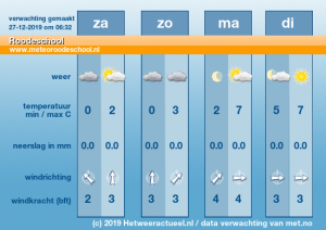 Morgen raakt het overal bewolkt en van het zuidwesten uit volgt er af en toe regen. In het loop van de middag trekt de regen naar het noordoosten weg. Er volgen dan ook enkele opklaringen maar een bui blijft mogelijk. Het wordt opnieuw zacht met maxima rond 13°C. De wind komt eerst uit het zuidoosten neemt toe naar matig tot vrij krachtig, aan zee en boven het IJsselmeer naar vrij krachtig tot krachtig. In de middag draait de wind naar zuid tot zuidwest en kan dan in de kustgebieden toenemen naar hard, 7 Bft.
