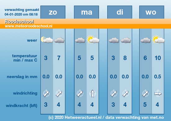 In de avond en komende nacht is het meest bewolkt met soms wat (mot)regen. De minimumtemperatuur ligt rond 5°C. De wind is zuidwest tot west, zwak, aan de kust matig 2 – 4 Bft.