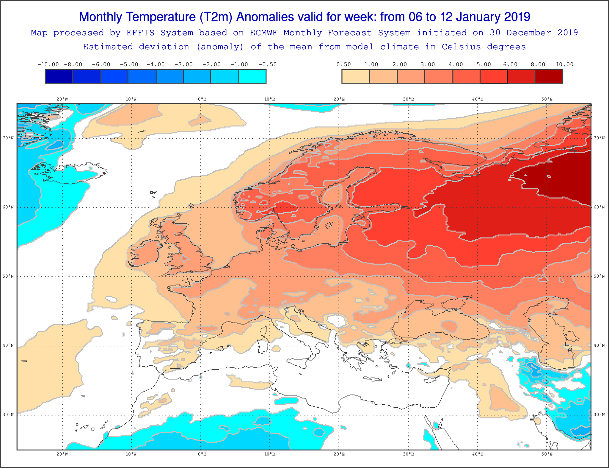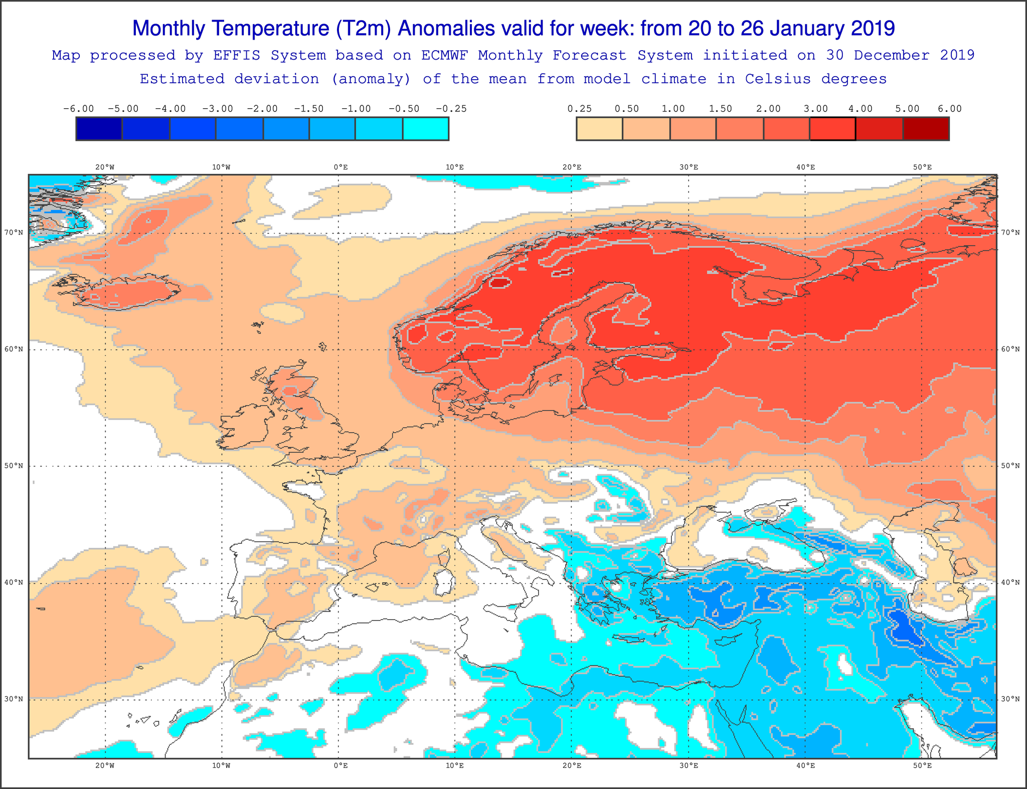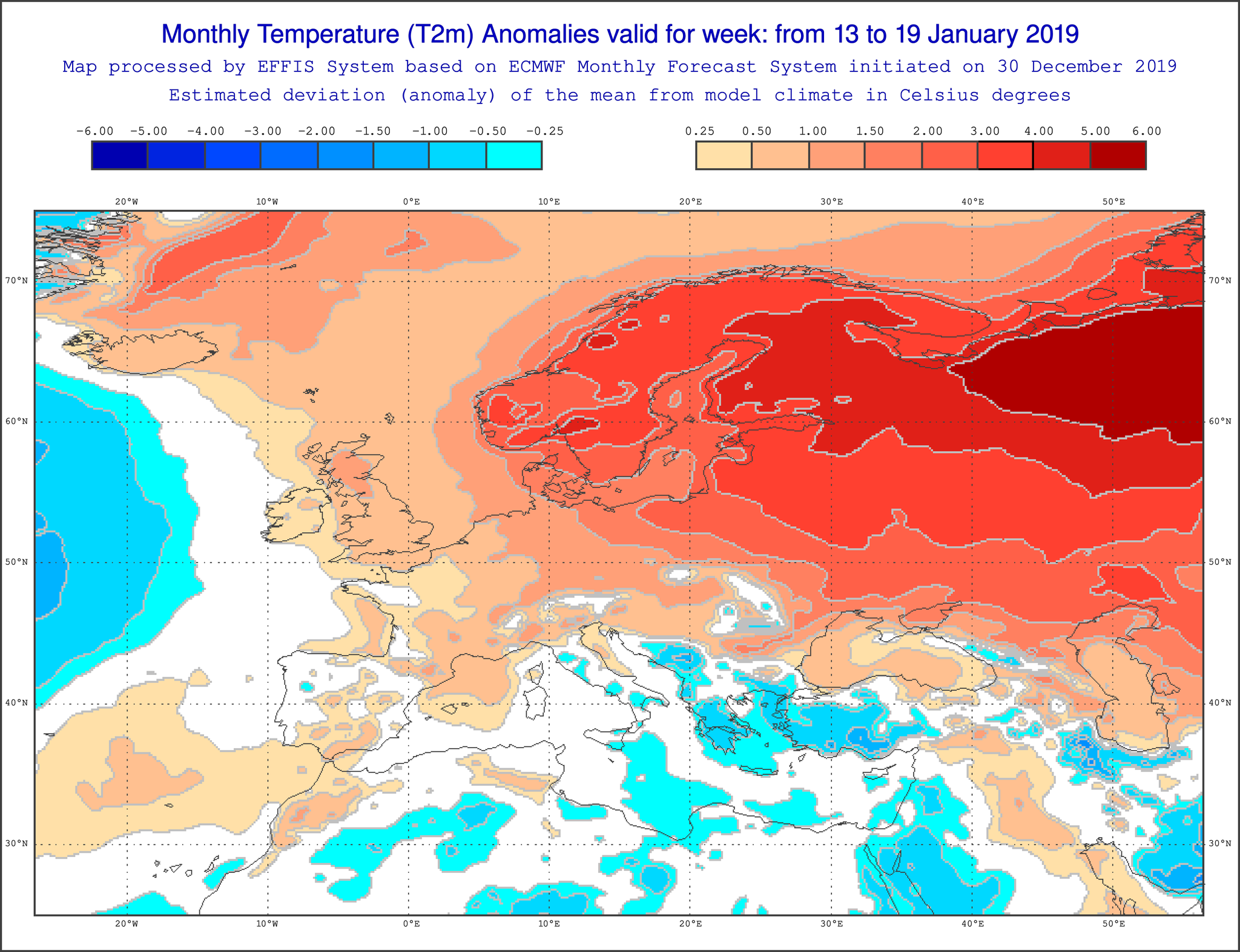 Het EMCF lange termijn verwachting bied weinig hoop voor de winterliefhebbers voor de rest van Januari: