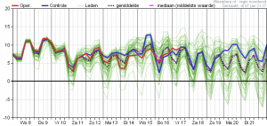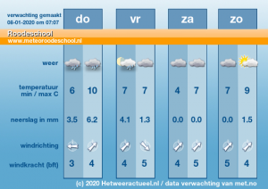 Zaterdag droog en in de nacht en ochtend een kleine kans op lichte vorst. Op de overige dagen is het licht wisselvallig. De maximumtemperaturen liggen (ruim) boven het langjarig gemiddelde.