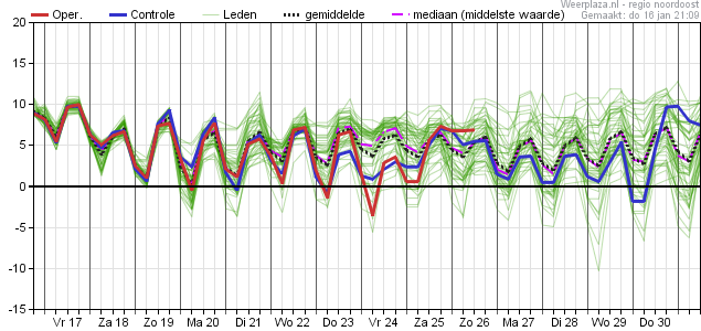 Komende nacht is het half tot zwaar bewolkt en kunnen er vooral in het noorden aanvankelijk nog enkele buien voorkomen. De minimumtemperatuur loopt uiteen van 2°C plaatselijk landinwaarts tot 5°C aan zee. De wind is westelijk en boven land overwegend matig, aan zee en op het IJsselmeer (vrij) krachtig.