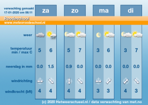 Morgen is er af en toe zon, maar komen er ook enkele buien voor. In de avond wordt het van het noordwesten uit op de meeste plaatsen droog en komen er wat bredere opklaringen voor. De middagtemperatuur komt uit op een graad of 7. De wind komt uit westelijke richtingen en is landinwaarts matig, aan zee vrij krachtig en in het noordelijk kustgebied af en toe krachtig.