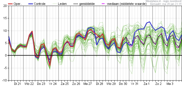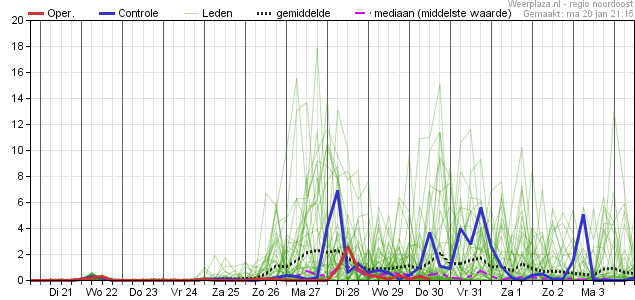 Komende nacht is het bewolkt en lokaal komt (dichte) mist voor. Aan het einde van de nacht valt er in het noorden lichte regen. De minima lopen uiteen van -3°C in het uiterste zuidoosten en +5°C in het uiterste noorden. Er staat een zwakke, aan zee matige zuidwestenwind. In het noorden draait de wind naar het westen.