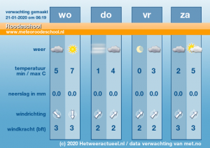 Morgen gaat het van het noorden uit af en toe licht regenen en lost de mist op. In de loop van de middag wordt het droog en klaart het in het noorden op. In de avond breiden de opklaringen zich langzaam zuidwaarts uit, maar later in de avond vormt zich weer mist. De temperatuur loopt op naar waarden tussen 3°C in het zuiden van Limburg en 8°C in het noordwesten. De wind is zuidwest en zwak. In de loop van de middag en avond draait de wind van het noorden uit naar noordelijke richtingen.