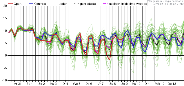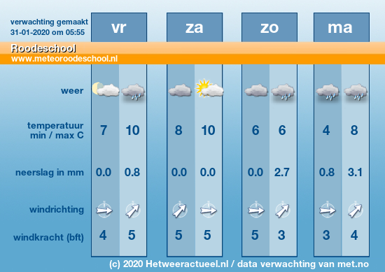 Vanochtend kan in het noordoosten eerst nog even de zon schijnen. Verder is het bewolkt en in de loop van de middag gaat het van het noordwesten uit af en toe (mot)regenen. Ook in de avond regent het van tijd tot tijd. De maximumtemperatuur ligt rond 11°C. De wind wordt zuidwestelijk en is boven land matig tot vrij krachtig, aan zee krachtig tot hard, 6 à 7 Bft.