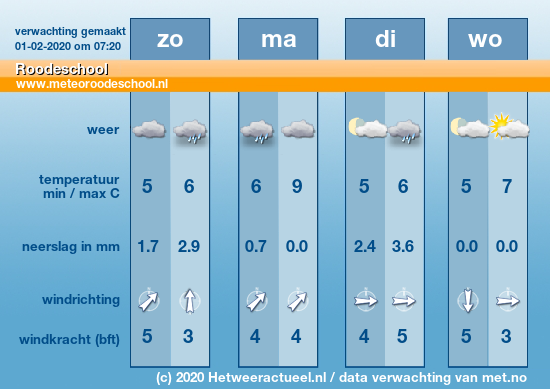 Morgenochtend begint nog droog maar als snel raakt het van het zuidwesten uit bewolkt en gaat het overal regenen. In de loop van de middag wordt het van het zuidwesten uit op steeds meer plaatsen weer droog. De maximumtemperatuur loopt uiteen van 8°C in het noorden tot lokaal 12°C in het zuiden van het land. In de ochtend staat er een matige wind uit zuidelijke richtingen. Vanaf het begin van de middag draait de wind van het zuidwesten uit naar west tot zuidwest en neemt opnieuw toe naar vrij krachtig, langs de kust naar krachtig tot hard, 6-7 Bft.