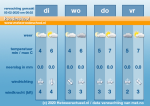 Morgen zijn er wolkenvelden en komen er geregeld buien, mogelijk met korrelhagel en onweer, voor. In de middag neemt de bewolking van het westen uit toe en gaat het met name in de zuidwestelijke helft langdurig regenen. De middagtemperatuur komt uit op ongeveer 6°C. De westenwind is matig tot vrij krachtig, aan de kust krachtig of hard 6 à 7 Bft.