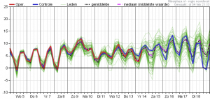 Aanvankelijk grote kans (ca. 80%) op een onstuimig weertype met kans op (zeer) zware windstoten. Later in de periode neemt de kans op een rustiger en droger weertype toe. De temperatuur ligt meestentijds (ruim) boven het langjarig gemiddelde.