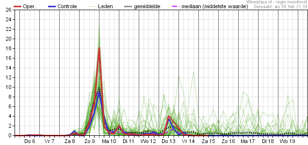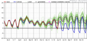 Aanvankelijk nog een grote kans (ca. 80%) op een wisselvallig weertype met mogelijk nog veel wind. Vervolgens een toenemende kans op een rustiger en droger weertype. De temperaturen lopen zeer waarschijnlijk op naar waarden ruim boven het langjarig gemiddelde.