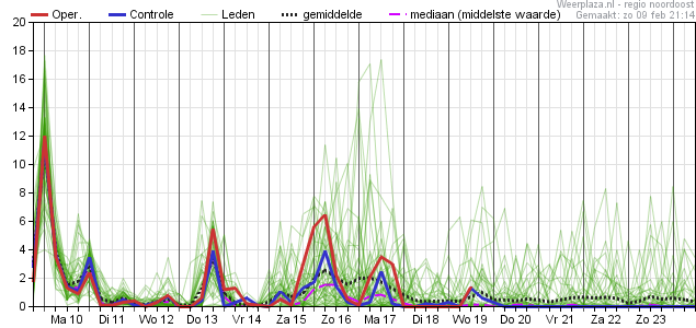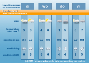 Het is half tot zwaar bewolkt met vanochtend verspreid over het land een aantal stevige buien, lokaal met onweer en korrelhagel. Later in de ochtend wordt het van het westen uit overwegend droog met vooral in het westen ook perioden met zon. In de loop van de middag raakt het van het zuidwesten uit bewolkt. Het wordt dan opnieuw buiig met plaatselijk onweer en hagel. In de loop van de avond kan er bij de buien ook plaatselijk natte sneeuw voorkomen. De middagtemperatuur komt rond 8°C uit. De west- tot zuidwestenwind blijft de hoofdrol spelen. Boven land is de wind (vrij) krachtig, aan zee stormachtig. In het hele land komen van tijd tot tijd zware windstoten van rond 80 km/uur voor, in de kustgebieden van 90-100 km/uur. Vanmiddag draait de wind naar zuidwest en neemt dan tijdelijk af. In de avond kan de wind aan de westkust mogelijk weer stormkracht bereiken.
