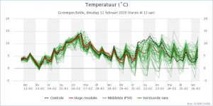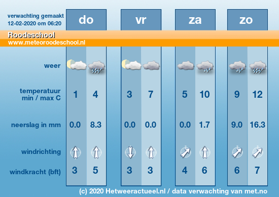 Morgenochtend is het bewolkt en van het zuidwesten uit gaat het enkele uren regenen. Met name in het oosten en noordoosten kan ook even natte sneeuw vallen. In de loop van de middag en avond trekken enkele stevige buien van west naar oost over het land. Hierbij is er kans op onweer, hagel en windstoten. Halverwege de avond wordt het van het westen uit op steeds meer plaatsen droog en klaart het tijdelijk op. De maxima lopen uiteen van 4°C in het noordoosten tot 10°C in het zuiden. Tijdens natte sneeuw daalt de temperatuur in het uiterste oosten en noordoosten lokaal tot ca.1°C. De wind draait in de ochtend naar zuidoost en neemt toe naar matig tot vrij krachtig, aan zee en op het IJsselmeer naar krachtig tot hard, 6-7 Bft. In de middag draait de wind van het zuiden uit naar zuidwest en neemt af naar matig, aan zee en op het IJsselmeer naar matig tot vrij krachtig, in het noorden naar zwak tot matig. In de avond draait de wind overal naar west.