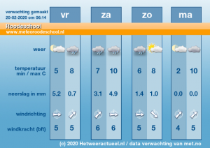 Morgen is het wisselend bewolkt en blijft het tot de avond droog. Vrijdag in de loop van de middag neemt de bewolking van het westen uit toe en gaat het in de avond met name in het noord(west)en regenen. De middagtemperatuur wordt ongeveer 9°C. De wind, zuidwest tot west, is boven land matig tot vrij krachtig en aan de kust en boven het IJsselmeer krachtig, in het Waddengebied soms hard.