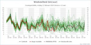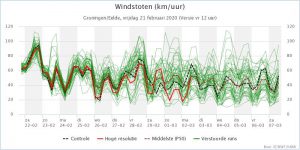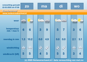 Morgen zijn er overal perioden met regen en in de zuidelijke helft kan er lokaal ca. 20 mm vallen. De middagtemperatuur wordt ongeveer 11°C. De westenwind is in het noorden zwak tot matig, in de zuidelijke helft krachtig, 6 Bft. Aan de zuidwestkust wordt de wind stormachtig, 8 Bft, terwijl elders aan de kust een vrij krachtige wind staat. Vooral in de zuidelijke helft is er kans op zware windstoten van 75 km/u, in het zuidwestelijk kustgebied mogelijk tot 90 km/u. In de loop van de middag wordt de wind noordwestelijk en boven land matig, in de kustgebieden vrij krachtig tot krachtig, 6 Bft. Aan het einde van de middag verdwijnen de zware windstoten.