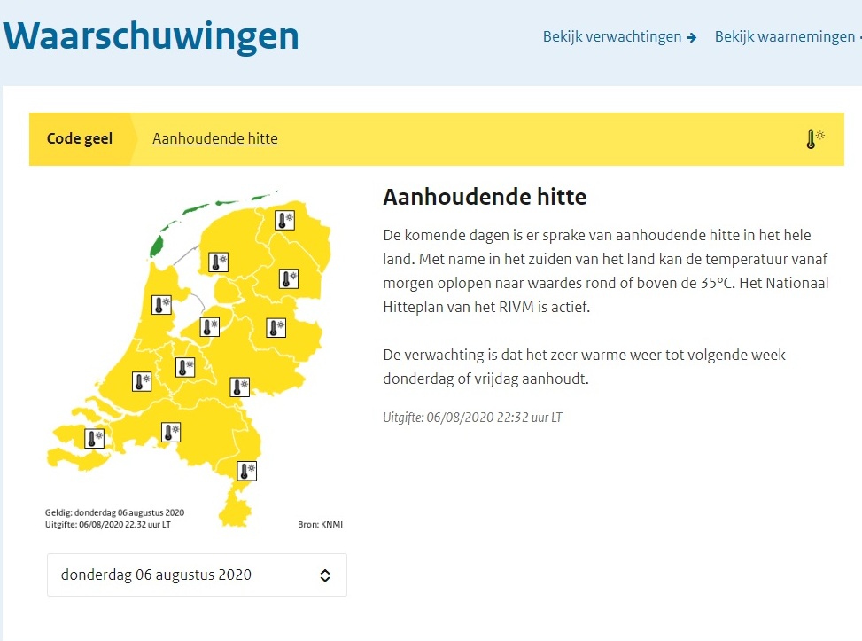 Aanhoudende hitte. Zondag met name in de noordelijke kustgebieden tijdelijk iets minder hoge temperaturen. De kans op een bui is de eerste dagen klein. Vanaf woensdag toenemende kans op een onweersbui.
