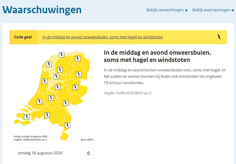 Er zijn wolkenvelden maar geleidelijk aan breekt de zon op steeds meer plaatsen door. Vanmiddag en vanavond komen er regen- en onweersbuien voor. Vooral in de zuidwestelijke helft zijn daarbij lokaal windstoten rond 70 km/u mogelijk en kan hagel voorkomen. De maximumtemperaturen lopen uiteen van 26°C in het Waddengebied tot 31°C in het oosten en zuidoosten. Er staat een zwakke wind uit oostelijke richtingen, in de avond komt de wind uit uiteenlopende richtingen.