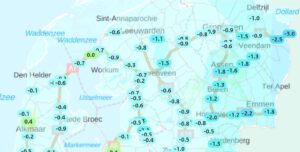 Vanochtend code Rood ivm ijzel. De wegdektemperatuur is nog onder het vriespunt (kaartje bron: Weerplaza)