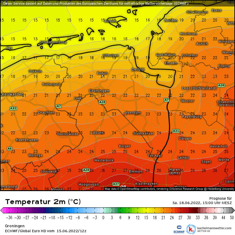 Zaterdag zijn er eerst opklaringen met de zon, later meer bewolking. In de middag toenemende kans op een regen of onweersbui, meeste in het kustgebied. De zuidwestenwind draait naar het noordwesten en is zwak tot matig 2- 3 Bft. De temperatuur loopt op tot rond 19 langs de kust tot 24 graden rond Ter Apel.