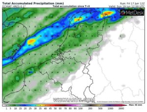 In de avond en nacht opklaringen en droog met een minimum temperatuur van ca 11 graden.