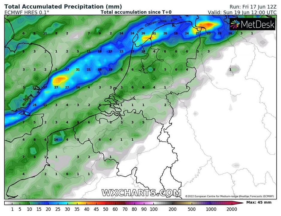 In de avond en nacht droog en vrij helder et een minimum temperatuur van ca 9 graden.