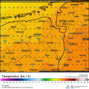 De dag begint zonnig, maar er komt in de loop van de dag meer bewolking. Het wordt 21 of 22 graden. De wind uit het zuidwesten tot later noordwesten is meest matig.