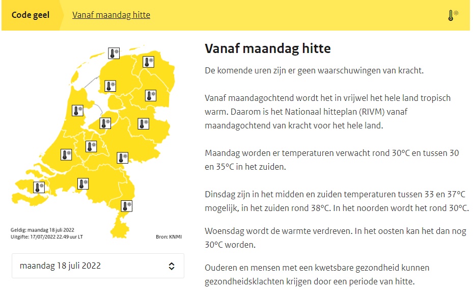 Dinsdag is het vrij zonnig en droog. Er wordt staat een zwakke tot matige oosten- tot zuidoostenwind 2 – 3 Bft. De middagtemperatuur loopt op naar tropische waarden tussen ca 31 tot 35 graden.