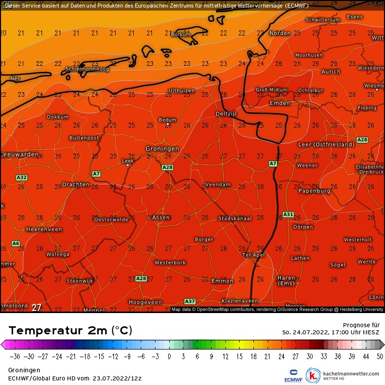 Vandaag is er rond de middag tijdelijk meer bewolking met kans op een bui, maar de zon komt ook aan bod. Het wordt ca 24 tot 28 graden met een zwakke tot matige zuidoost tot zuidwestenwind 2 – 4 Bft.