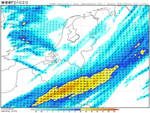 Zaterdag is het droog met flinke zonnige perioden. Met een zwakke tot matige noordwestenwind 2 – 4 Bft wordt het maximaal ca 20 tot 22 graden.