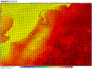 Maandag en dinsdag vrij zonnig en droog en wordt het op maandag maximaal 22 tot 24 graden en dinsdag wordt het weer warmer met zomerse temperaturen van ca 25 tot 27 graden.