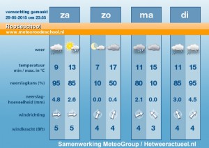 Vandaag is het eerst wisselend bewolkt met buien. De buien gaan lokaal gepaard met onweer en hagel. In de middag neemt de buiigheid van het westen uit sterk af en komt de zon goed tevoorschijn. Vanmiddag wordt op veel plaatsen een graad of 15. De westelijke wind is matig, aan de kust vrij krachtig. Vanavond neemt de wind boven land geleidelijk af en draait naar zuidwest tot zuid.