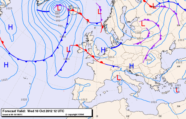 In de bovenlucht trekt de komende uren een kortgolvige hoogtetrog over de Duitse Bocht verder naar het zuidoosten. De rugas die nu boven de Britse Eilanden ligt trekt oostwaarts en wordt morgenmiddag boven ons land verwacht. In het gronddrukpatroon strekt een hogedrukgebied zich uit van Schotland tot over het midden van Duitsland waarbij de noordwest-zuidoost georiƫnteerde as over ons land ligt. De komende nacht ligt het zwaartepunt van het hoog boven Duitsland met een rug over ons land richting de noordelijke Noordzee. Donderdag arriveert een lagedrukgebied boven Ierland. Deze trekt maar heel langzaam naar het oosten en zakt tegelijkertijd enigszins uit. Donderdagavond ligt er dan een langgerekt laag van Schotland naar Het Kanaal. De bijbehorende fronten blijven ook nog ten westen van ons land.