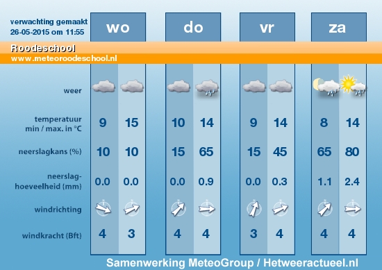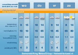 Er zijn wolkenvelden en lokaal is een lichte bui mogelijk. Tegen de avond klaart het van het westen uit tijdelijk op. De middagtemperatuur ligt tussen 12 graden op de Wadden en 17 graden in het zuidoosten. De noordwestenwind is matig. ’s Avonds neemt de wind af naar zwak en draait naar west.