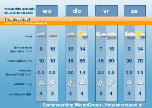 Vanochtend is er vrij veel bewolking, in het zuidoosten schijnt eerst nog de zon. Vanmiddag kan er in het midden en oosten van het land een enkele lichte bui voorkomen. In de middag breekt van het westen uit de zon door. Vanavond neemt de bewolking van het westen uit weer toe. De maxima liggen tussen 14 graden op de Wadden en 20 graden lokaal in het zuiden. De west- tot zuidwestenwind is overwegend matig.